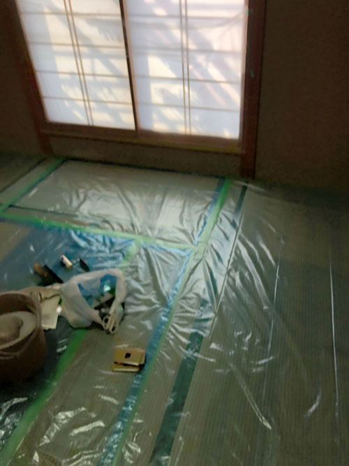 まずは養生をし、ジュラクを落としていきます。