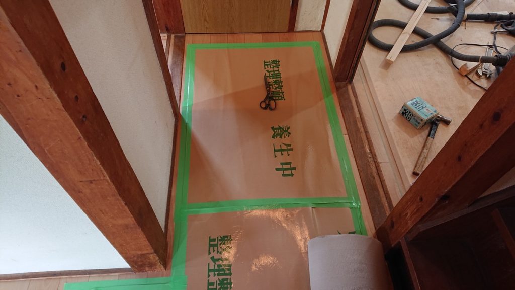 フローリングを貼り、天井クロス下地も貼りました。