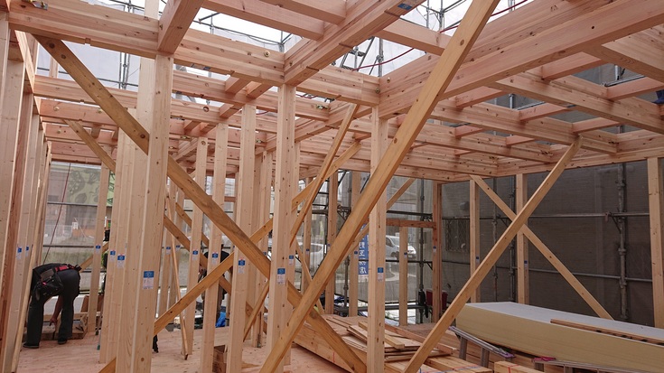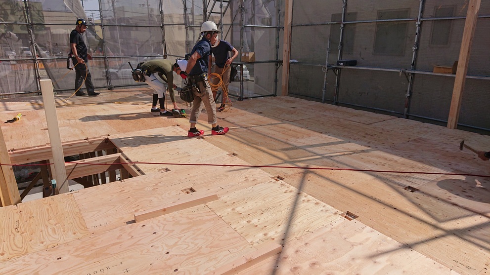 二階床下合板施工後、材料を乗せて10時の休憩。