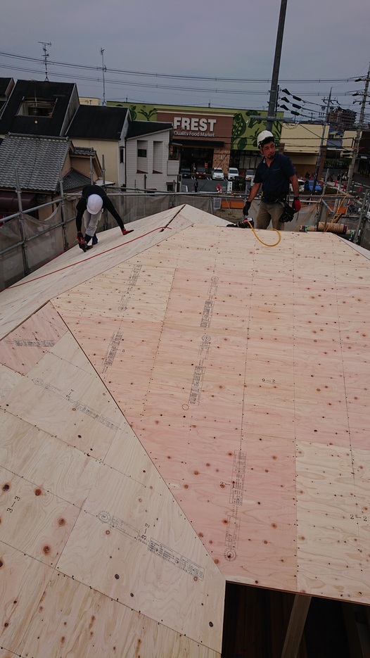屋根下地合板施工、全面にブルーシートを貼って