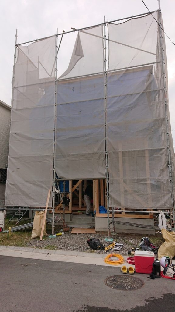 足場のシートを貼ってから作業開始です。