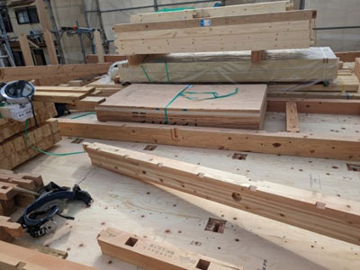 午前10時には二階床合板は貼り終わり、材料を乗せて休憩。