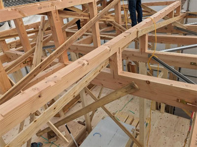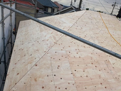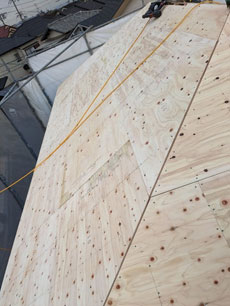 大屋根の下地合板施工、