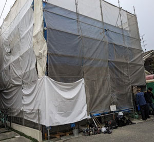 雨よけのブルーシートを張り巡らせました。