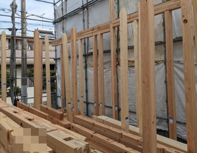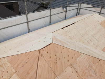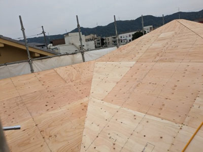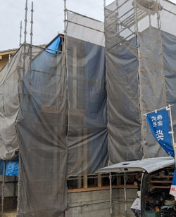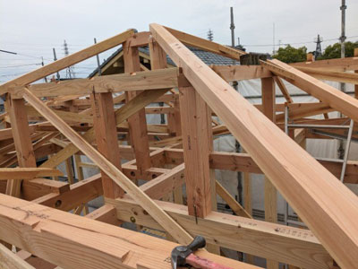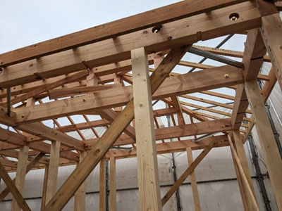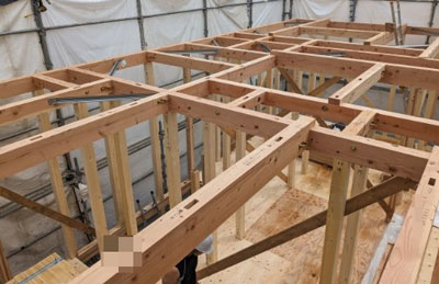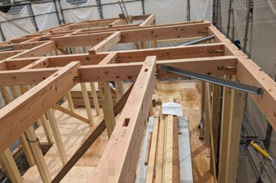 2階床下下地まで組み終わり、材料を乗せて休憩。