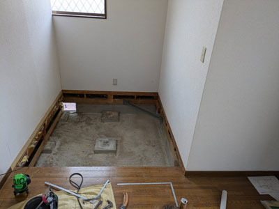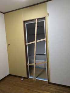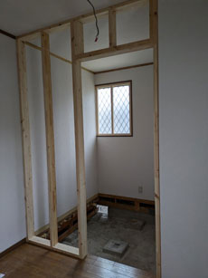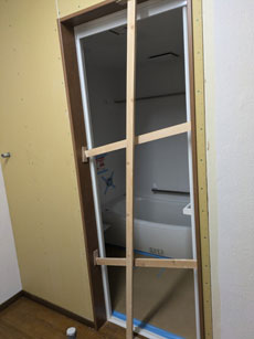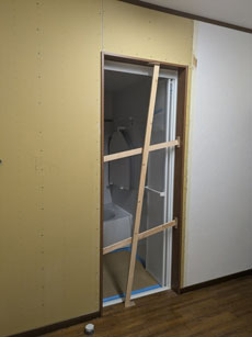 入り口ドア枠を取付け、石膏ボードを貼りました。